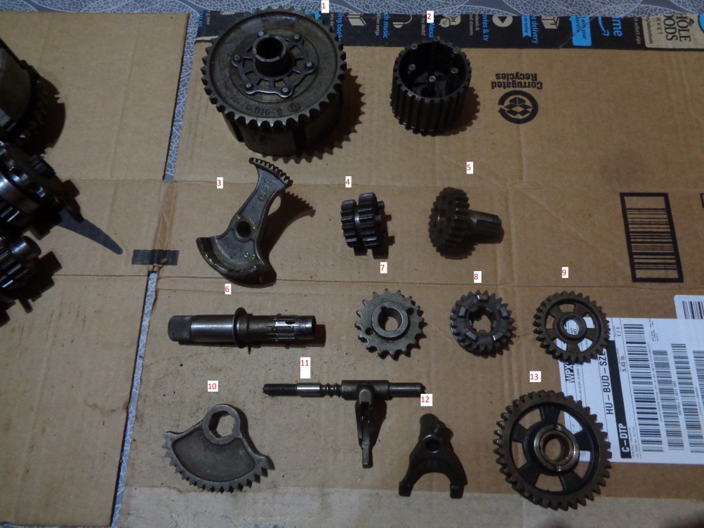 Tudna valaki segíteni a fotón látható alkatrészek beazonosításában? Én úgy hiszem ez Trophy vagy TS 125/150 kuplung és váltó alkatrész. Ha jól tudom ETZ-nél már duplasoros volt a lánckerék a kuplungon és a főtengelyen. 4-es, 5-ös fogaskerék azt hiszem összetartozik. (ETZ-nél az 5-ös fogaskerék már ablakos (?)) 13-as fogaskerék méreténél fogva talán nem 125/150 alkatrész.